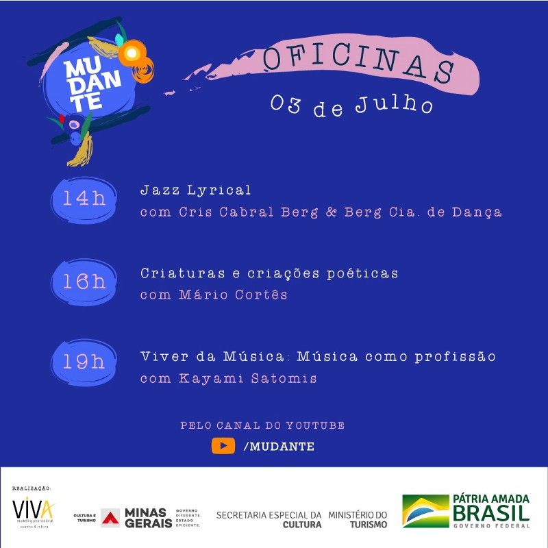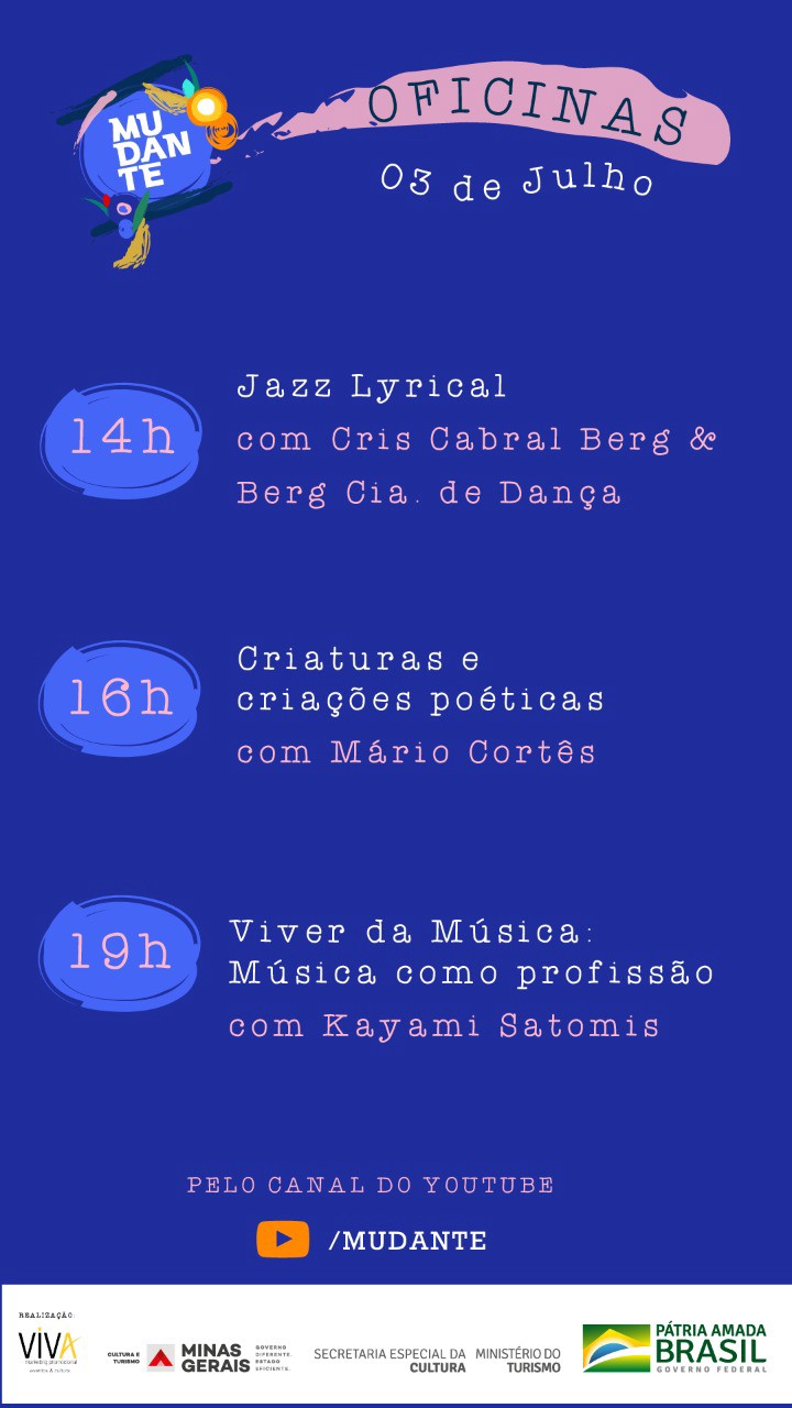 Neste sábado, a partir das 14h, será ministrado três oficinas virtuais sobre teatro, dança e música, no canal do YouTube: Mudante. O mesmo canal que vai estrear o espetáculo “Verbos da Vida” no dia 10 de julho.