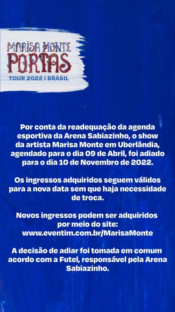 A readequação da agenda esportiva da Arena Sabiazinho fez com que o show de Marisa Monte fosse adiado para o dia 10 de novembro. A apresentação da cantora ocorreria no próximo sábado (9).