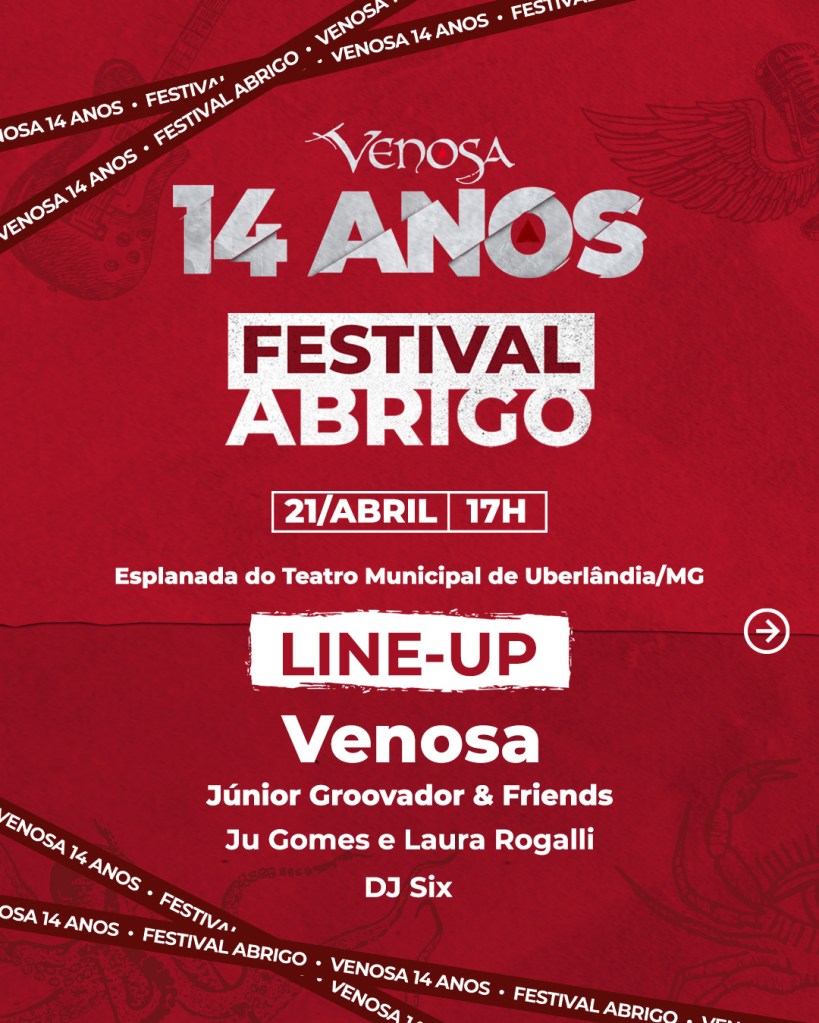 O clima de confraternização, alegria, amizade e festa vão tomar conta da Esplanada do Teatro Municipal, na próxima sexta-feira (21). Já chama todo mundo para curtir, pois o Festival Abrigo irá reunir grandes atrações, unir belas vozes e, ainda ajudar quem precisa. Mas ainda tem mais, nós iremos celebrar os 14 anos da banda Venosa.