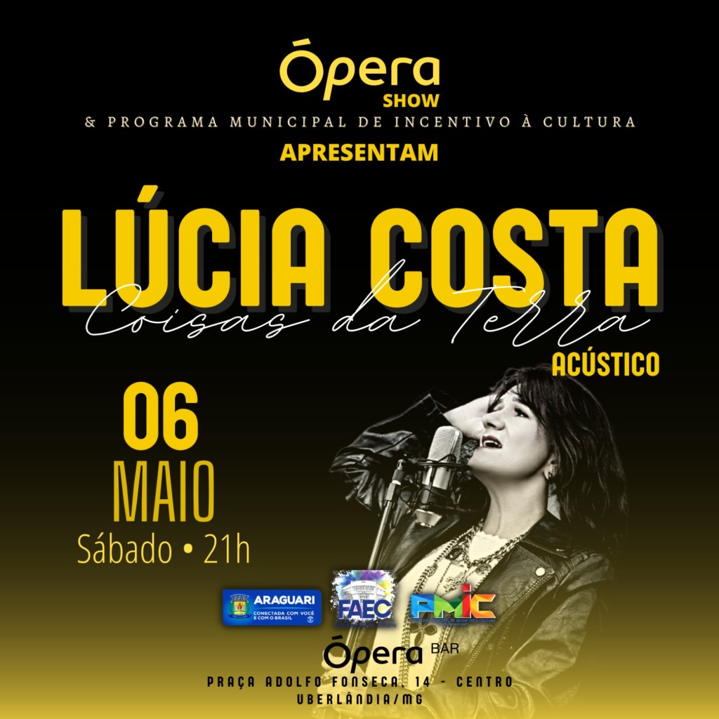 Tendo essa veia pulsando em diversos ritmos e o coração com batidas tão diferentes, podemos esperar o imprevisível no seu projeto acústico intitulado “Coisas da Terra”. Você pode conferir esse trabalho, pensado em todos os detalhes, e conferir a potente e envolvente voz, da cantora, natural de Araguari, no próximo sábado (06), no Ópera Bar. Já faça sua reserva. O estabelecimento, além de fortalecer e incentivar a cena independente, também busca trazer projetos inéditos e artistas talentosos que trabalham longe dos holofotes.