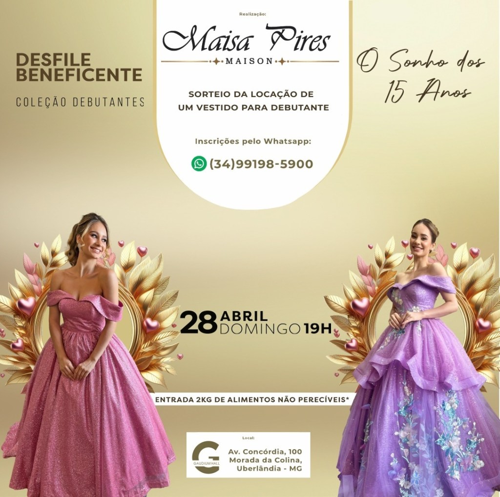 Ateliê Maisa Pires vai realizar um desfile beneficente no dia 28 de abril onde serão arrecadados alimentos para serem doados a uma instituição e quem está no preparativos da festa de quinze anos vai poder conhecer as principais tendências e novidades. Na ocasião, acontecerá o sorteio de uma locação de vestido para debutante. Para participar, basta levar 2kg de alimentos não perecíveis.