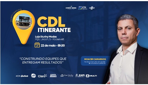 No próximo dia 22 de maio, a partir das 8h30, a Câmara de Dirigentes Lojistas (CDL) de Uberlândia promoverá mais uma edição do CDL Itinerante. O consultor de Estratégia de Negócios, Moacir Camargos abordará o tema: ‘Construindo Equipes que Entregam Resultados’. O evento acontecerá na Sturiny Modas, localizada na praça Lincon, número 5. Os interessados podem se inscrever pelo site da CDL Uberlândia (www.cdludi.org.br). A entrada para o evento é franca.