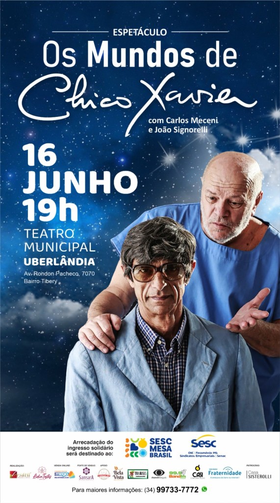 Esses mundos são muito bem representados no espetáculo “Os Mundos de Chico Xavier”, que chega a Uberlândia no próximo dia 16 de junho, para única apresentação, no Teatro Mercado Municipal. A peça retorna a Uberlândia depois de grande sucesso em 2023. Já garanta seu ingresso no site ou, presencialmente, na Samsara Espaço Esotérico, na Avenida Cesário Alvim, 619, Centro.