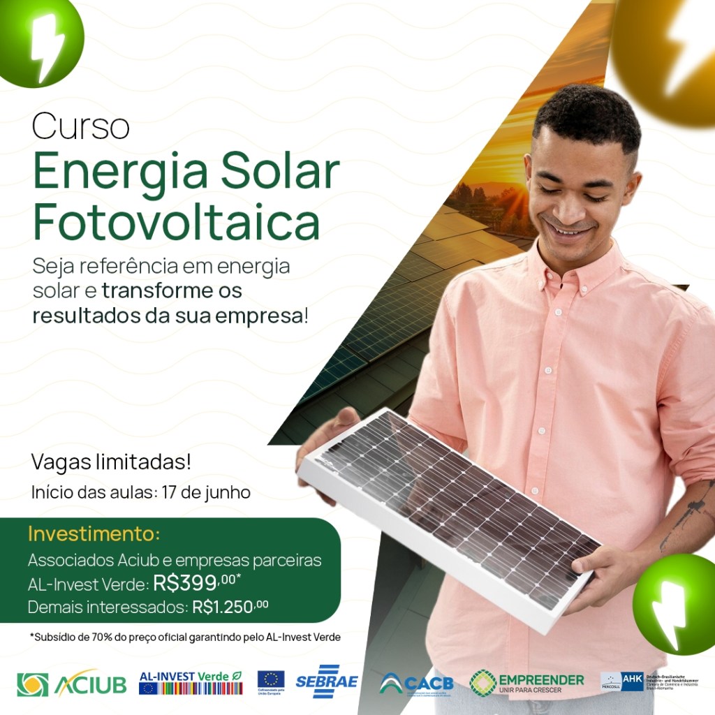 O mercado de energia solar vem crescendo em um ritmo positivo no Brasil. Por isso, quem trabalha ou empreende na área precisa ficar atento às novidades e tendências. Para apoiar aqueles que atuam no setor a potencializarem seus resultados, a  Aciub – Associação Comercial e Industrial de Uberlândia por meio do seu projeto no Programa Al-Invest Verde, em parceria com a AHK Rio, promovem o curso ‘Energia Solar Fotovoltaica – do projeto à instalação’. Os interessados podem se inscrever em aciub.com.br/inscricoes. O valor para associados e empresas ligadas ao Al-Invest é de R$399,00, e para público em geral é R$1.250,00.