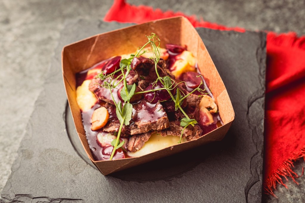- Duo purê com aguiletes de filé mignon e cogumelos ao molho frutado;