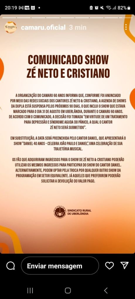 A organização do Camaru 60 Anos informa que, conforme foi anunciado por meio das redes sociais dos cantores Zé Neto & Cristiano, a agenda de shows da dupla está suspensa pelos próximos 90 dias, o que inclui o show que estava marcado para o dia 31 de agosto em Uberlândia, durante o Camaru 60 Anos. De acordo com o comunicado, a decisão foi tomada “em virtude de um tratamento para depressão e síndrome aguda do pânico, a qual o cantor Zé Neto será submetido”.