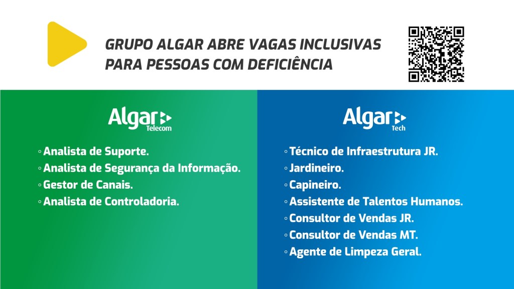 Várias vagas estão abertas em empresas do grupo Algar para pessoas com deficiência. Há oportunidades para diferentes setores de atuação e em vários estados do país, com diferentes modalidades de trabalho (home office ou presencial). Todas as vagas disponíveis e a inscrição para os processos seletivos, podem ser conferidas pelo site algar.com.br/carreiras ou clicando aqui.