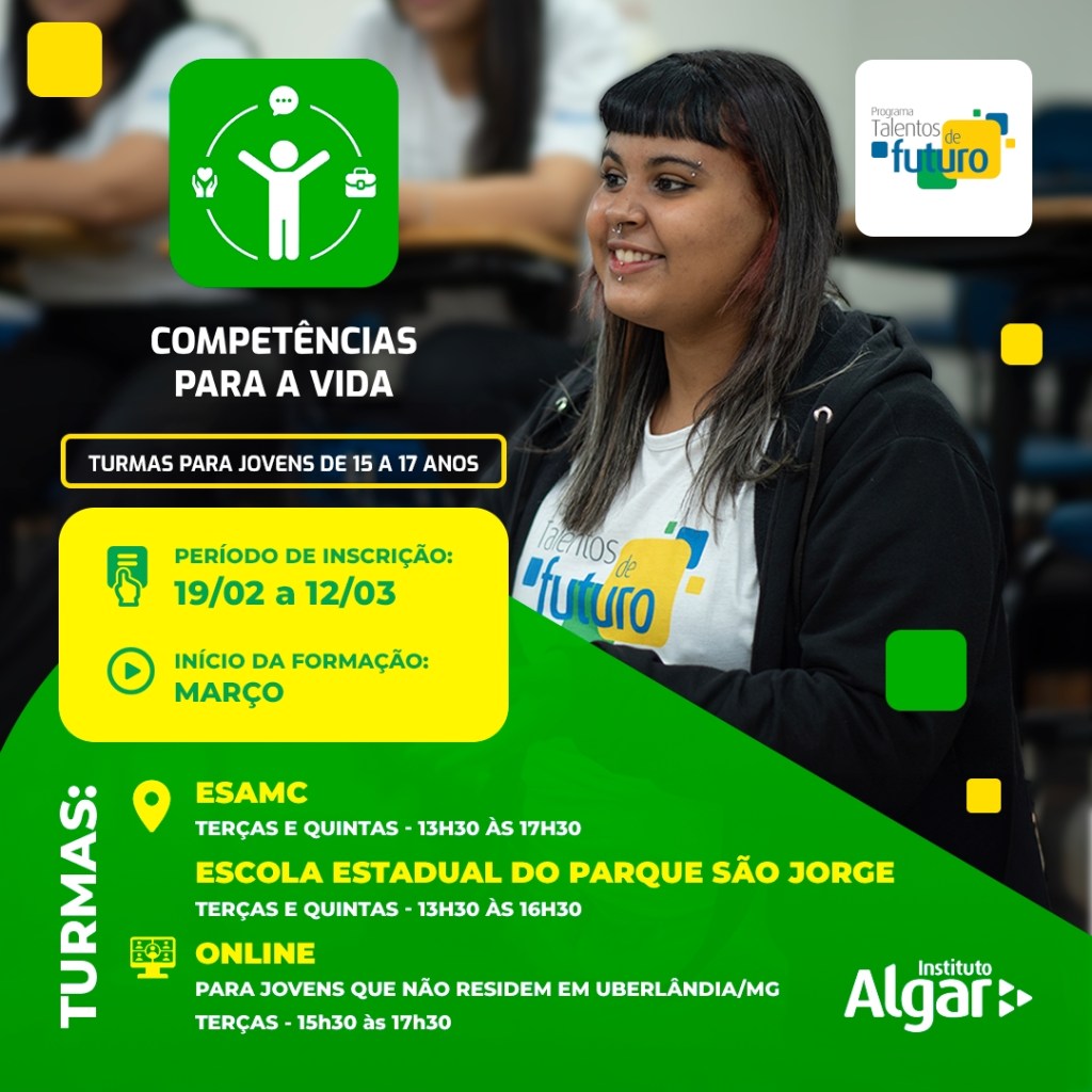 Jovens que estão na faixa etária entre 15 e 17 anos têm a oportunidade de participar de uma formação gratuita do Instituto Algar. A formação busca desenvolver competências para a vida e facilitar a entrada no mercado de trabalho. As inscrições para o Talentos de Futuro já estão abertas pelo site talentosdefuturo.com e jovens de qualquer parte do país podem participar da turma online da iniciativa. Além disso, para aqueles que residem em Uberlândia (MG), há a opção de participar de turmas presenciais.