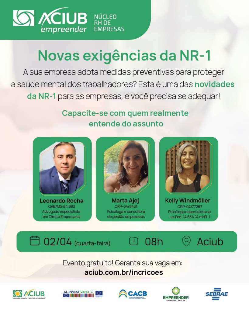 A atualização da Norma Regulamentadora 1 (NR-1) e seus impactos nas empresas, serão tema de um painel promovido pelo Núcleo RH de Empresas do programa Empreender da Aciub. O evento acontece no dia 2 de abril de 2025, a partir das 8h, no auditório da Associação.