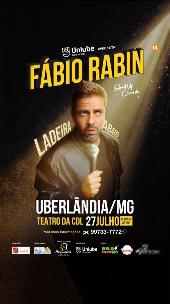 Um dos comediantes mais conhecidos e com uma trajetória consolidada, Fábio Rabin Chega a Uberlândia com o seu novo show de comédia “Ladeira abaixo”. Nós podemos esperar piadas afiadas irônicas com atualidades e situações cotidianas do comediante que costuma contar com a participação da plateia.