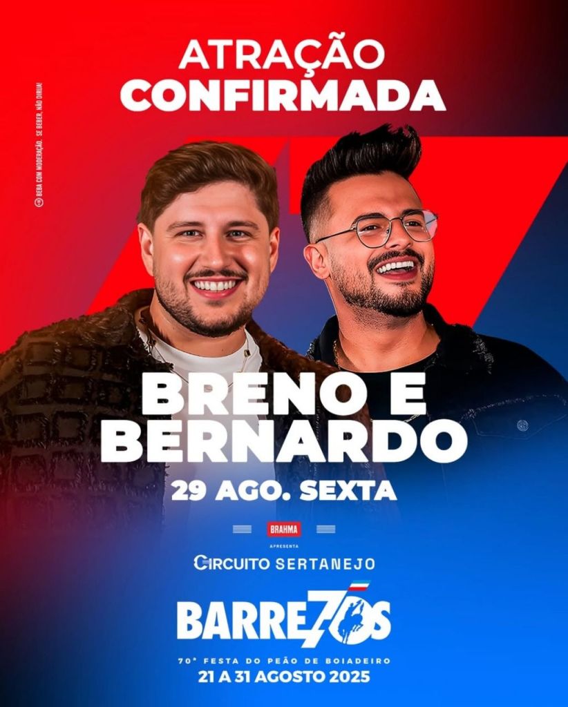 A tradicional Festa do Peão de Barretos, considerada o maior evento de rodeio da América Latina e um verdadeiro templo da música sertaneja, chega à sua 70ª edição em 2025 reunindo grandes nomes do gênero. Entre os artistas confirmados está a dupla Breno & Bernardo, que retorna ao evento pelo segundo ano consecutivo, consolidando sua presença na cena sertaneja nacional.