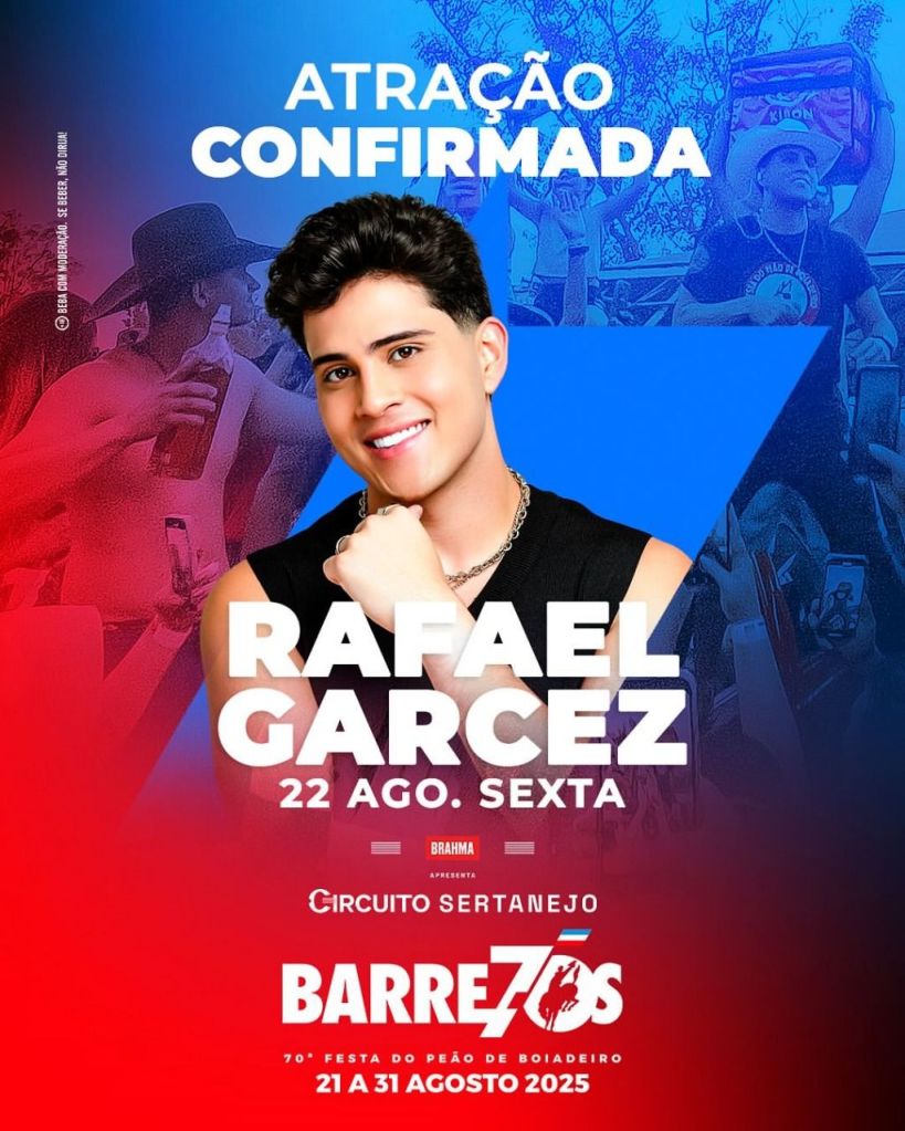 A 70ª edição da Festa do Peão de Barretos acaba de confirmar a participação de uma das grandes promessas da nova geração sertaneja: Rafael Garcez. O cantor fará sua estreia no evento no dia 22 de agosto, com apresentação no Palco Camping, dividindo a programação com os artistas VH & Alexandre e Us Agroboy.