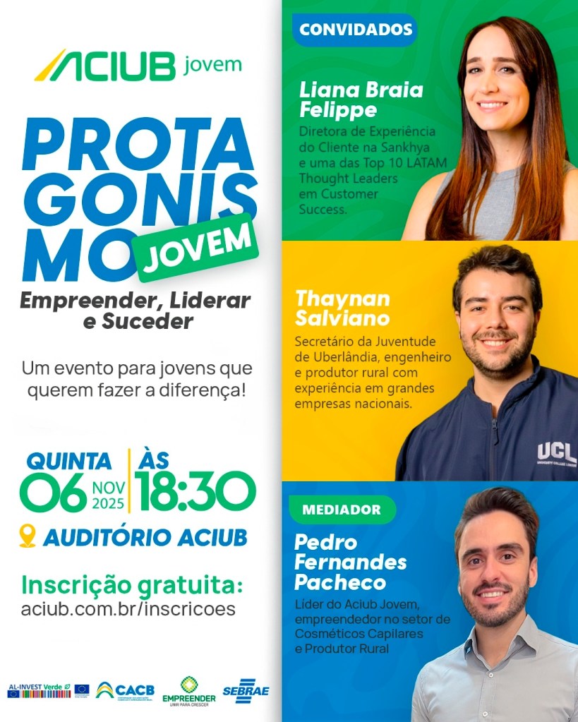 Os convidados da noite para debater o tema são a diretora de Experiência do Cliente na Sankhya|TOP 10 LATAM, Liana Braia Felippe, especialista em Customer Experience e liderança empresarial; e o secretário da Juventude de Uberlândia, Thaynan Salviano, Engenheiro Mecânico pela UFU, com experiências na Petrobras, Infraero e Prefeitura do Rio de Janeiro, além de produtor e gestor rural certificado pela Embrapa, Emater e Ministério da Economia. O encontro será mediado por Pedro Fernandes Pacheco, líder do Aciub Jovem, que conduzirá o diálogo sobre as perspectivas da juventude empreendedora e o papel dos jovens na transformação dos negócios e da sociedade.