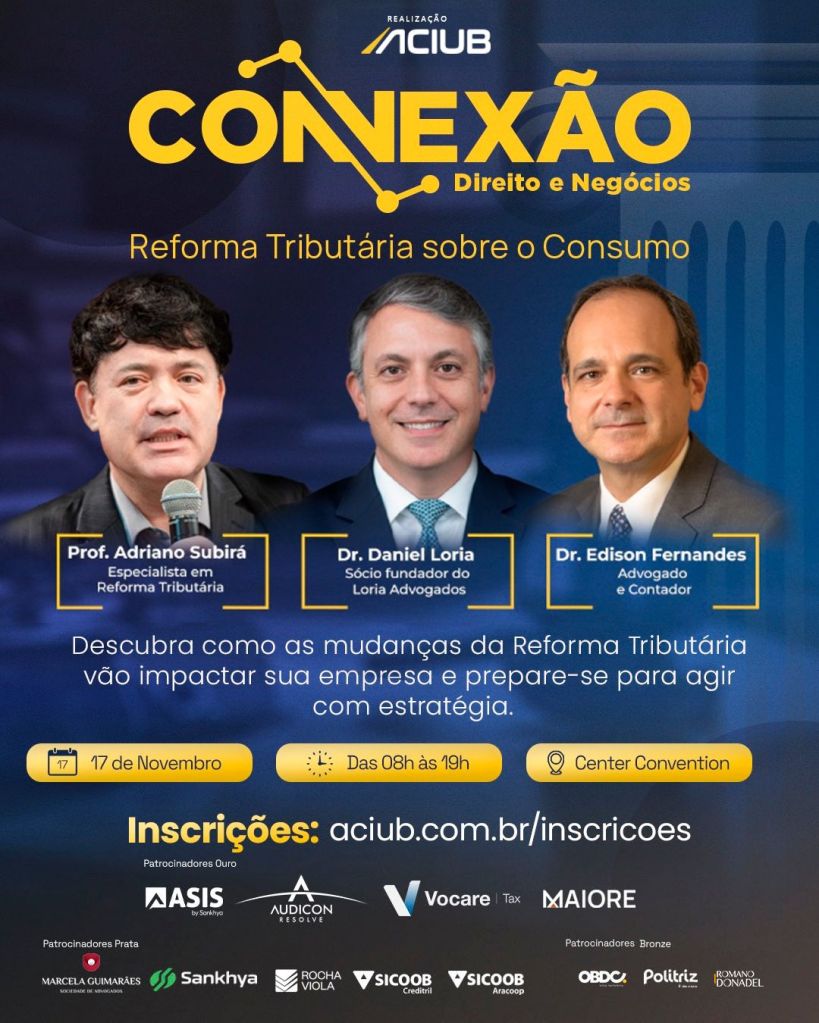 A Associação Empresarial de Uberlândia – Aciub realiza, no dia 17 de novembro, o Conexão: Direito & Negócios, que nesta edição traz como tema “Reforma Tributária sobre Consumo”. O encontro tem como objetivo aproximar o conhecimento jurídico e empresarial, oferecendo aos participantes uma visão prática e estratégica sobre as mudanças que irão transformar o ambiente tributário e os negócios no Brasil.