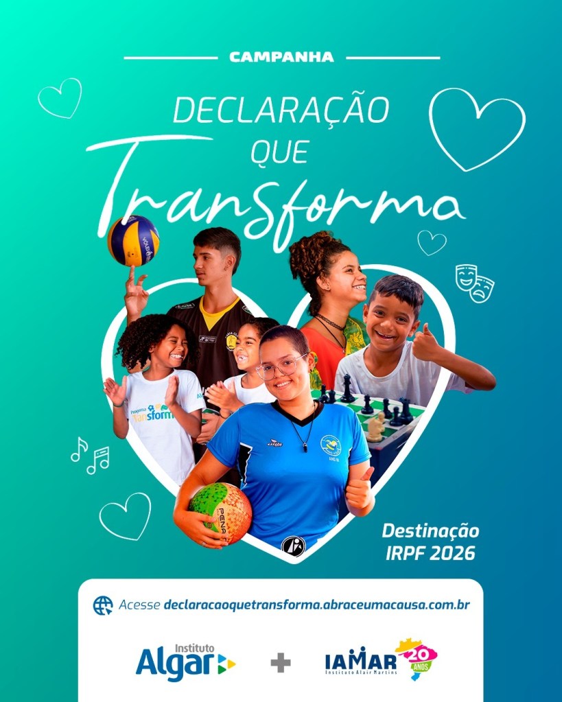 É possível contribuir com projetos sociais que oferecem oportunidades e desenvolvimento para milhares de crianças sem gastar nada, utilizando a destinação do imposto de renda (IR). Pessoas físicas já podem fazer doações de até 6% do IRPF devido para iniciativas apoiadas pelo Instituto Algar e receber a restituição do valor destinado ou o abatimento do valor a ser pago ao fazer a Declaração do Imposto de Renda 2026. A arrecadação será direcionada para a realização de oficinas de artes cênicas e atividades esportivas em organizações sociais de algumas cidades do país. As doações podem ser destinadas pelo site declaracaoquetransforma.abraceumacausa.com.br.