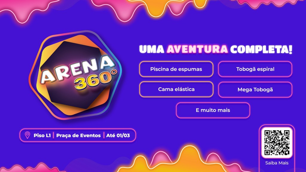 É hora de pular, escorregar e se divertir em 360 graus! A Arena 360º desembarca no Center Shopping entre os dias 18 de janeiro e 1º de março, na Praça de Eventos (Piso L1), trazendo um circuito repleto de atrações pensadas para crianças e adolescentes. Entre os brinquedos estão cama elástica, piscina de espumas, tobogã espiral e mega tobogã