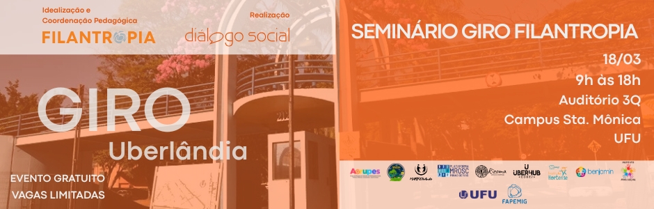 Na próxima semana, dia 18 de março de 2026, Uberlândia recebe o Giro Filantropia – Seminário Itinerante do Terceiro Setor, que acontecerá no Auditório do Bloco 3Q, no Campus Santa Mônica da Universidade Federal de Uberlândia (UFU), a partir das 9h. As inscrições são gratuitas e podem ser realizadas pelo site dialogosocial.com.br/uberlandiaa/#inscricao